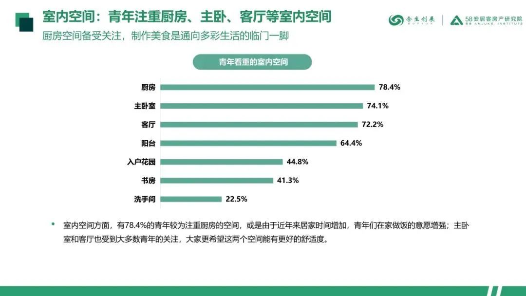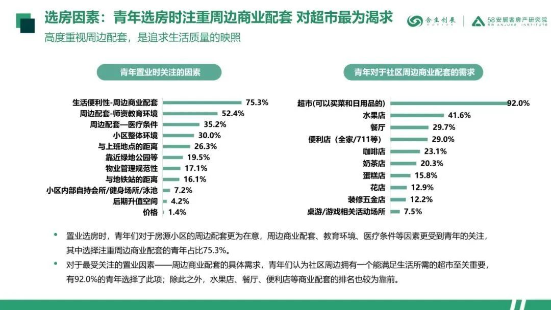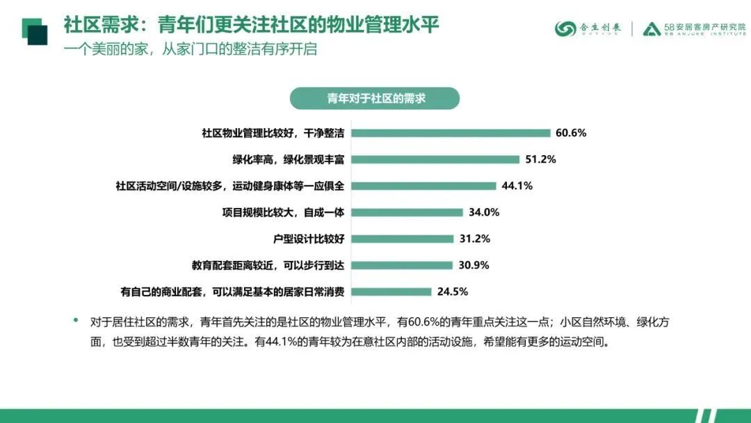 黄埔青年选房时最注重房源周边的商业配套,多数人希望社区附近有超市;对于社区内部,青年们更在意其物业的管理水平,绿化及运动设施;室内空间方面,青年们对于厨房、主卧、客厅等较为注重。