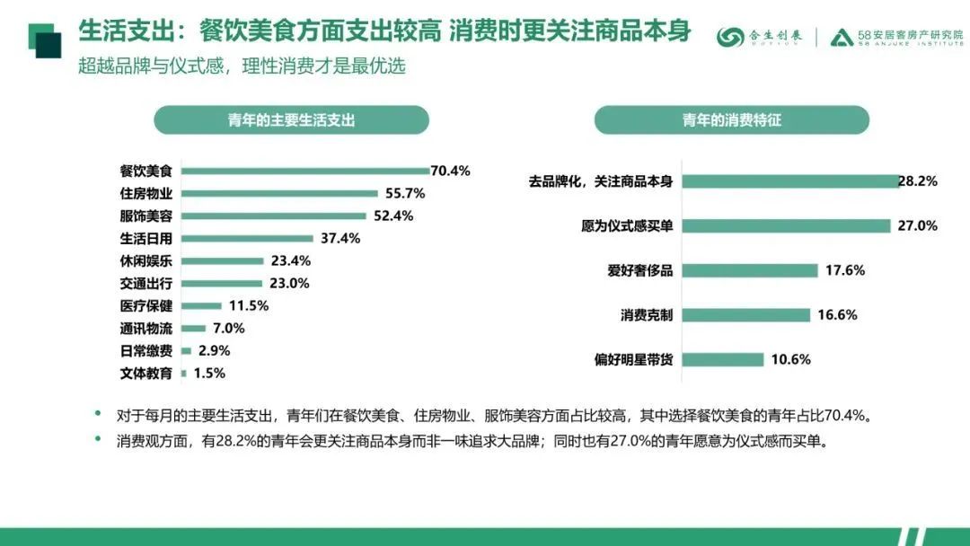 生活支出上,青年们在餐饮美食、住房物业、服饰美容方面占比较高,消费时会更关注商品本身而非一味追求大品牌;也有27.0%的青年愿意为仪式感而买单。
