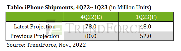 展望23年第一季度,这一时期的经济前景已经相当悲观。此外,冬季通常有利于COVID-19等疾病的传播。因此,中国有可能在未来以更频繁的速度实施零疫情封锁。这种情况将把这一政策的影响延伸到需求端,扰乱苹果当季的iPhone生产计划。中国国内需求约占iPhone总销量的20%。假设未来全球经济表现不是特别积极,中国正在实施的“动态零疫情政策”对供需双方的影响可能会导致iPhone季度出货量目标向下修正。目前,iPhone在23年第一季度的出货量预计将达到5200万部。不过,TrendForce不排除向下修正400 ~ 600万部的可能性。此外,23年第一季度iPhone出货量同比下降幅度可能进一步扩大至20%以上。