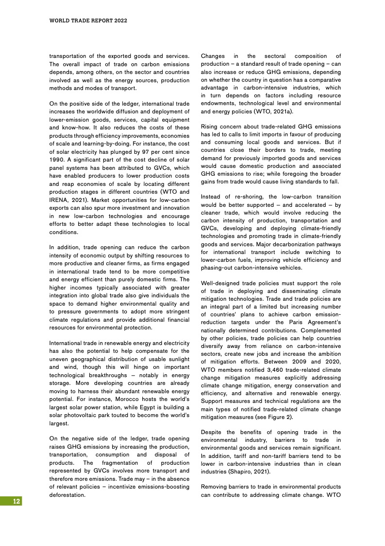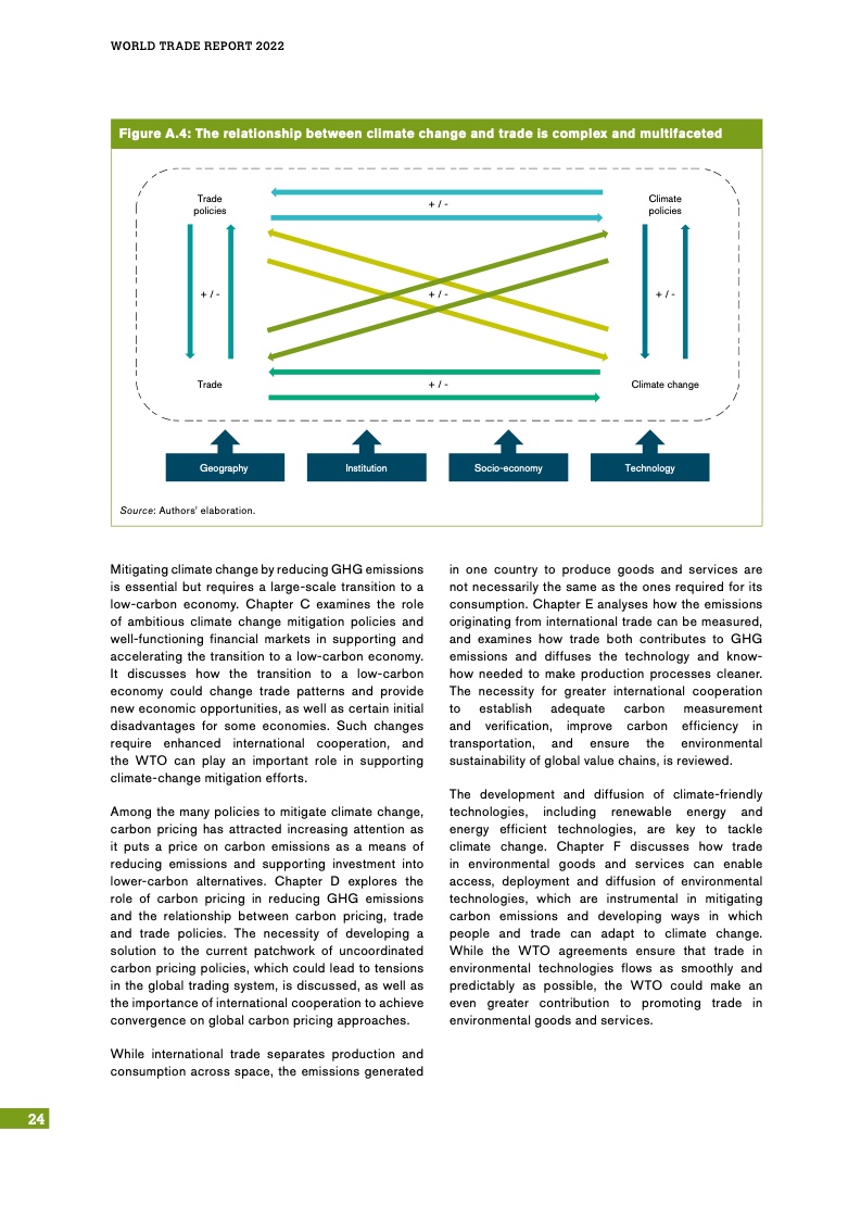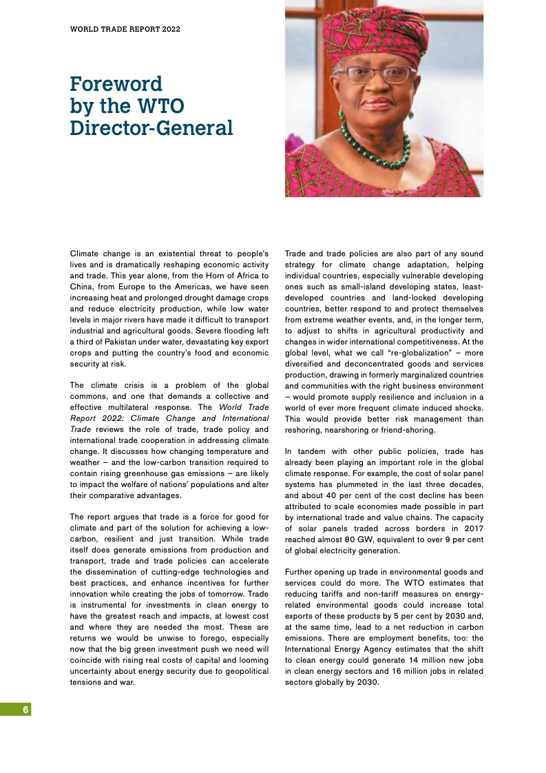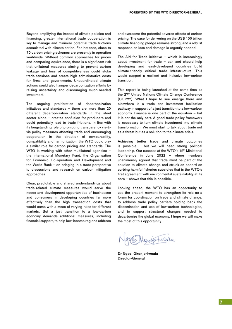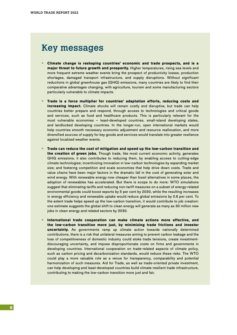 “这份报告是在第27届联合国气候变化大会上发布的。我希望通过这份报告看到的是一条支持向低碳经济公平过渡的贸易和投资便利化道路。”正在参加气候峰会的总干事恩戈齐-奥孔乔-伊韦拉在报告的前言中说,“报告认为,贸易是一种有利于气候改善的力量,是实现低碳、有韧性和公平过渡的解决方案的一部分。”