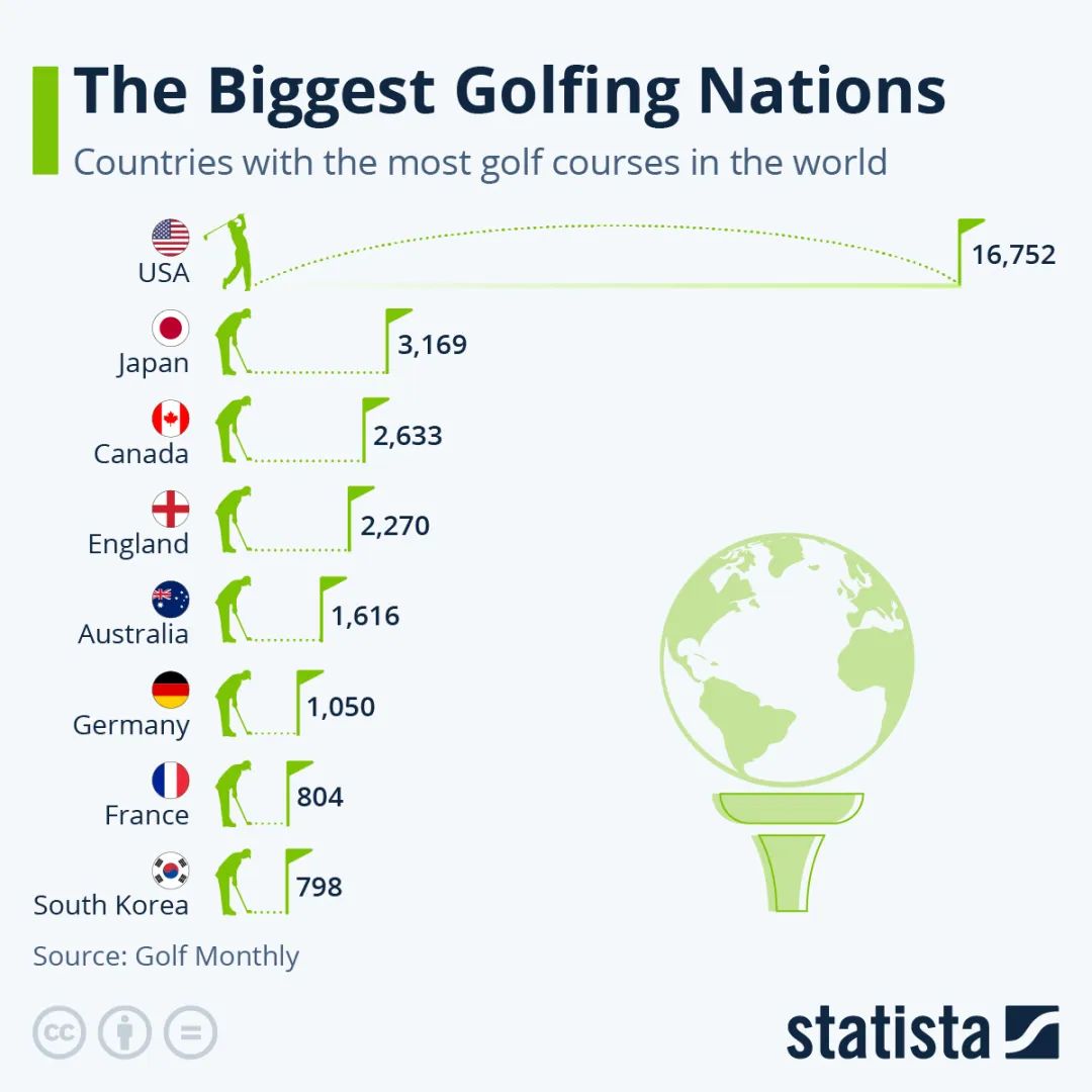 据专业在线杂志《高尔夫月刊》估计,美国拥有全球43%的高尔夫球场。它拥有16752个球场,是排名第二的日本的五倍多。日本拥有约3169个球场。在欧洲国家中,英国拥有最多的2270个,其次是德国的1050个和法国的804个。