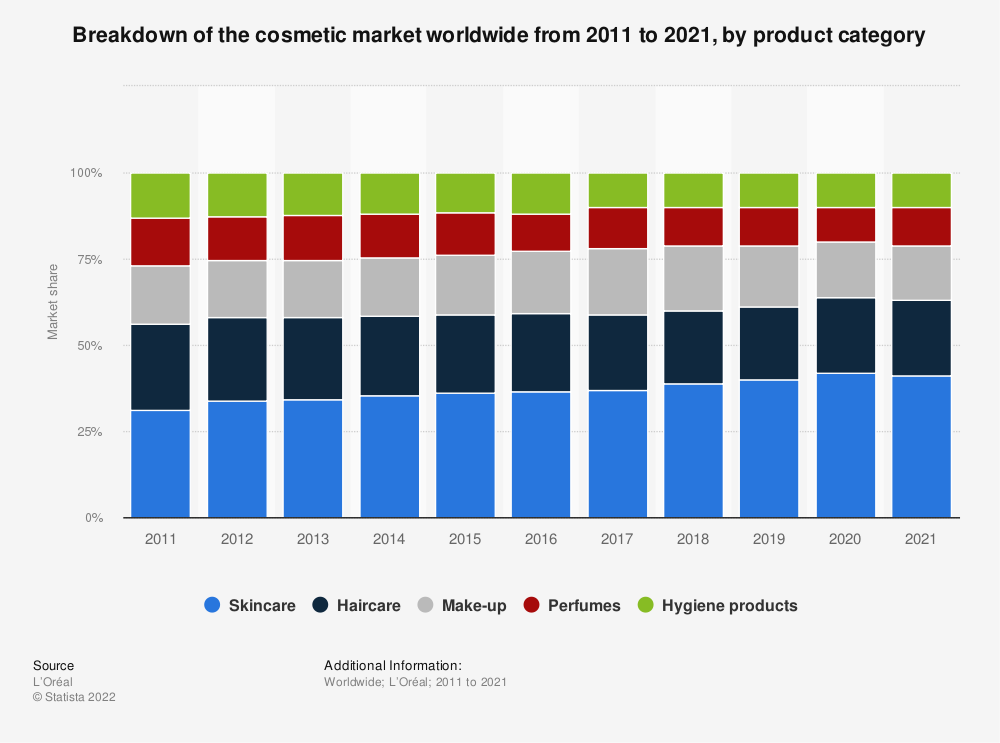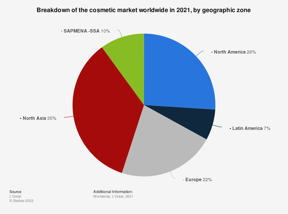 该统计数据按产品类别描述了2011年至2021年全球化妆品市场的细分情况。2021年,护肤品占全球化妆品市场的41%。从地理上看,北亚和北美占主导地位,占据了化妆品市场的60%以上。