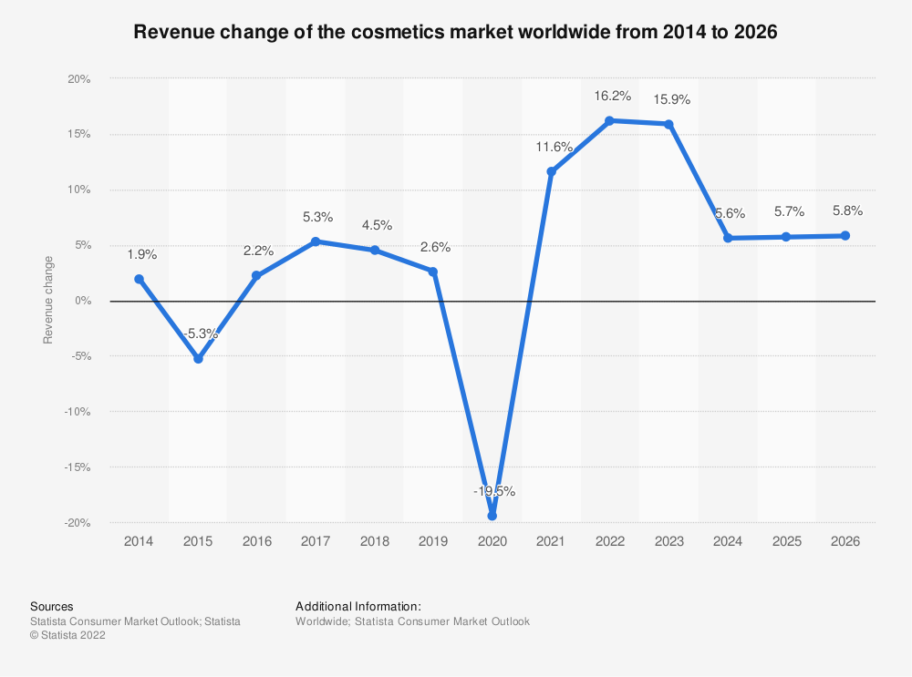 2021年,全球化妆品市场的收入同比增长约11.6%。Statista消费者展望估计,到2023年,这一。