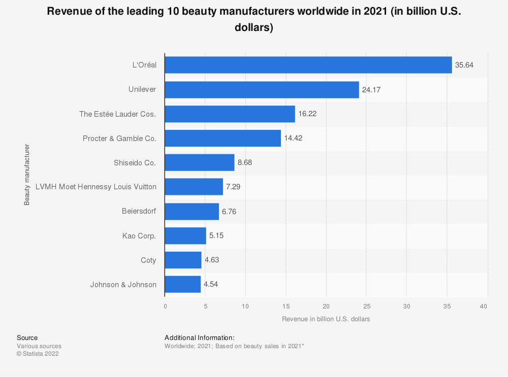 该统计数据是以2021年的化妆品销售额为基准,统计了全球排名前10位的化妆品企业2021年的销售额。在那一年,L’Oréal是全球排名第一的美容产品制造商,收入约356亿美元。