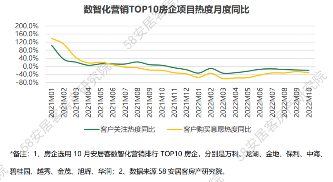 整体看来10月头部房企关注热度上涨,但购买意愿热度环比下降,有效热度不足。10月数智化营销榜单TOP10房企的全国项目客户关注热度环比上涨3.5%,同比下降19.3%,同比降幅增加1.5个百分点。其中龙湖、越秀、华润置地等涨幅最大。主要因龙湖集团在国庆期间举行主题为“龙湖黄金周,十一狂欢购”的活动,此外,龙湖集团在全民营销方面发力较大,多个城市的项目业主可以通过龙湖U享家赚取佣金、物业费等,带动线上热度增加。但代表房企的客户购买意愿热度环比下降5.5%,同比下降31.2%,同比增加5.4个百分点。行业下行压力持续,叠加疫情影响,全国各地持续的促销活动虽然带来关注热度的上涨,但因客户消费信心未有回暖,因此购买意愿热度下降。未来2个月房企资金链愈加紧绷,年终业绩冲刺势必将加大营销力度,对市场进行持续刺激。
