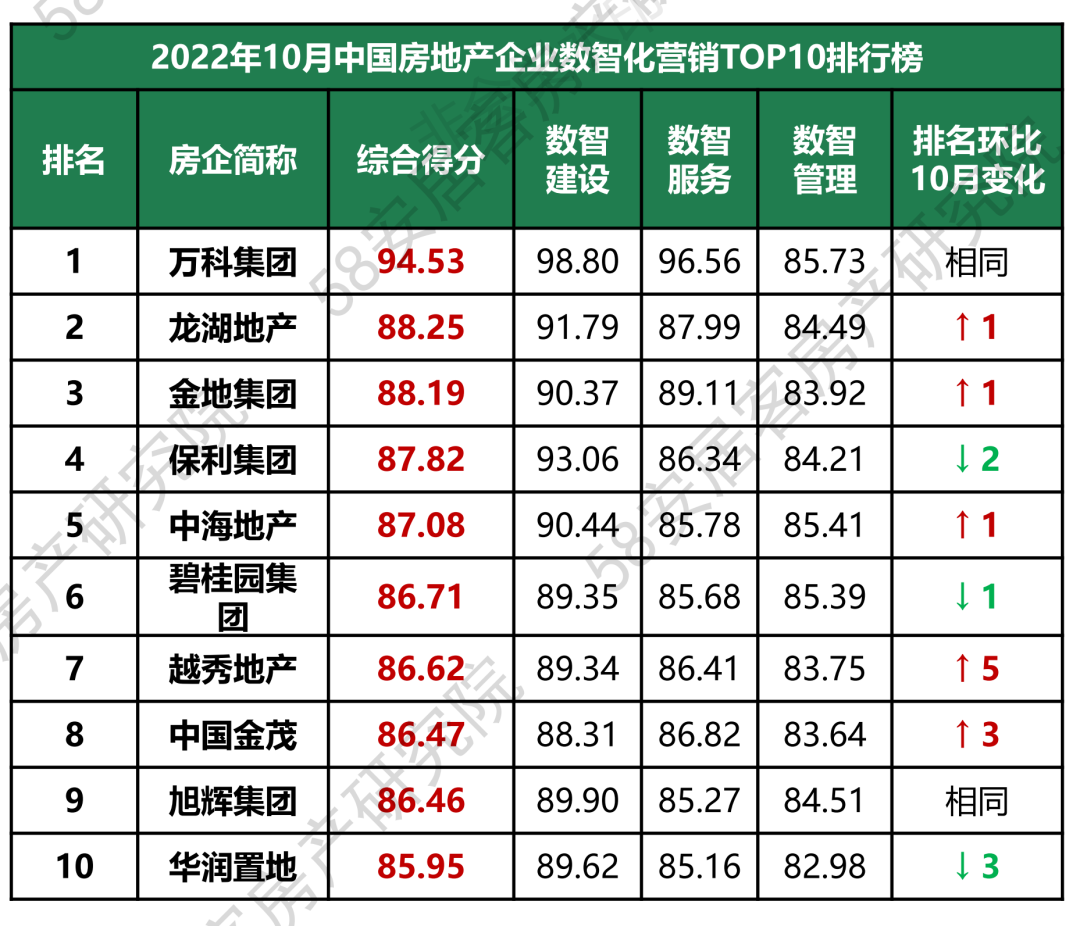 10月万科、龙湖、金地、保利、中海、碧桂园、越秀、金茂、旭辉、华润位居数智化营销房企前十强。房企本月排名环比上月变动较多,其中越秀、金茂排名分别上升5位和3位,上升较为明显。