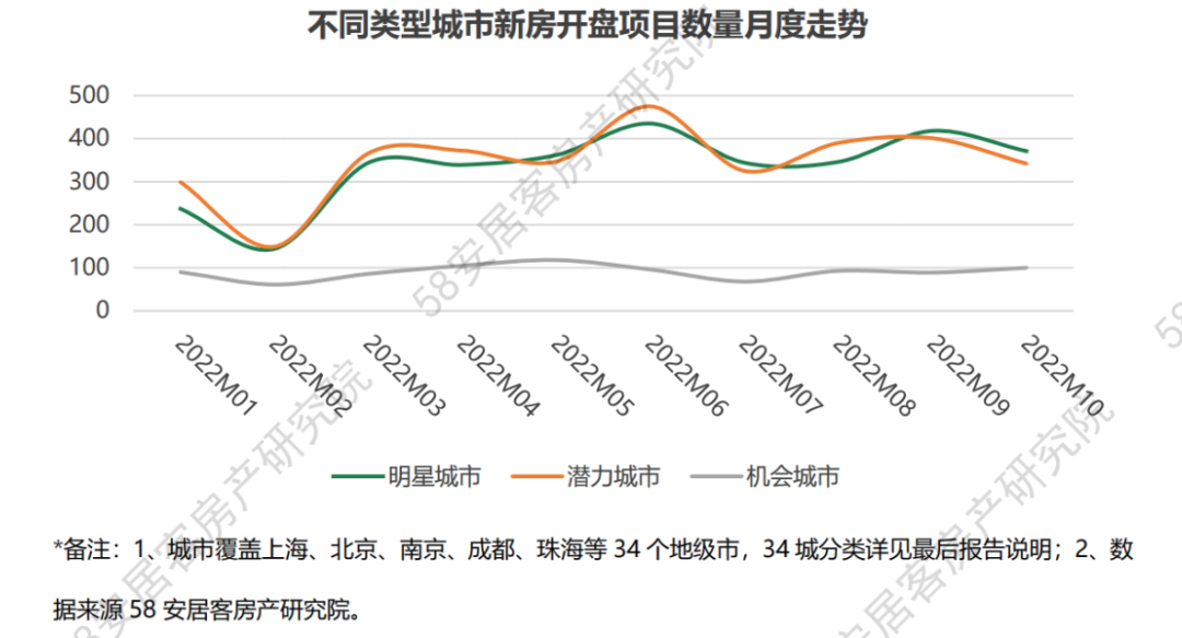 从不同类别的城市分类来看,机会城市本月增幅最大。10月机会城市开盘量为100个,环比上月增加11个,主要因为福州在上个月开盘量极少,本月开发商开盘释放的房源与往年基本持平,闽侯县、仓山区等开盘量较多。明星城市开盘项目量为371个,环比9月减少了47个,带动明星城市开盘量减少的主要为武汉、长沙等。潜力型城市整体开盘量为342个,环比上月减少59个,其中广州、佛山等开盘量减少较多。