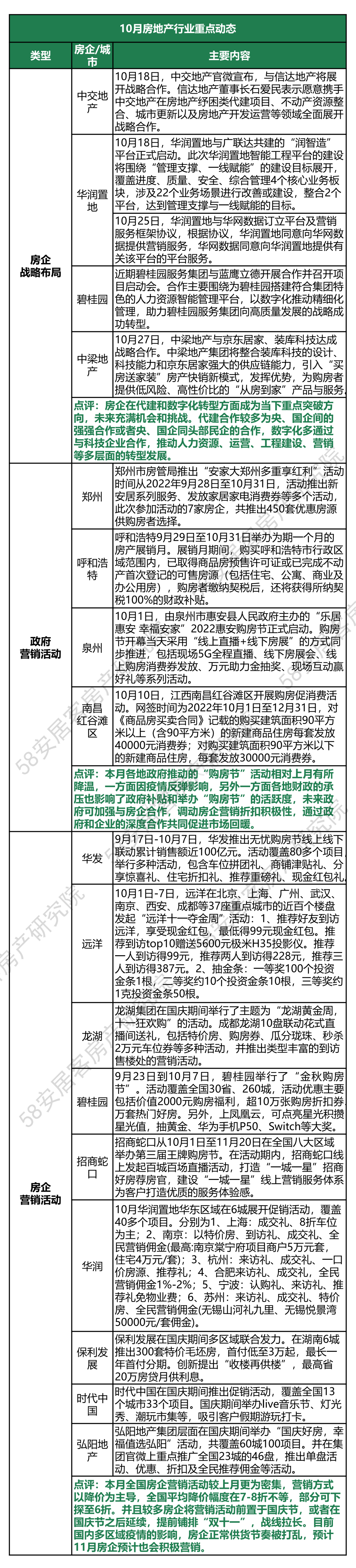 10月在全国各地政策助力下,政府推动和房企花式促销积极性较高。在房企战略布局上,中交与信达着眼于“纾困类代建项目”强强联合,华润、碧桂园、中梁从营销、工程建设、人力资源和整体产业链与相关企业加强合作促进数字化转型;在政府推动营销方面,政企合作推出“购房节”,郑州和泉州与当地房企一起推出购房优惠促销活动,呼和浩特发放契税补贴、南昌红谷滩区政府直接发放购房消费券;在房企营销方面,房企积极把握“国庆”假期提前铺排供货,企业普遍加大了折扣营销,平均降价幅度在7-8折不等,部分下探至6折。华发、远洋、碧桂园、招商蛇口 、时代中国、弘阳地产在全国进行折扣等多重方式促销,龙湖成都区域、华润华东区域、保利发展湖南区域折扣促销,保利的“收楼再供楼”为营销方式带来新思路。
