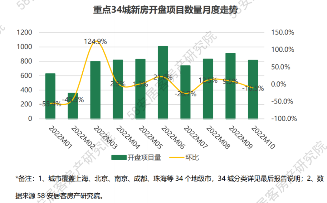 10月重点34城市开盘项目量出现下降,10月开盘项目量为813个,上个月开盘量为908个,环比下降10.5%。其中开盘量减少较多的城市有徐州、广州、长沙、武汉等城市,徐州市区商品住宅市场新增供应量环比下降超过50%,广州因为疫情影响,推盘节奏受到抑制。