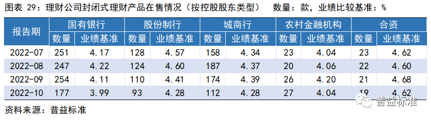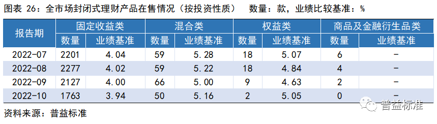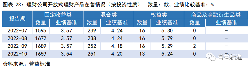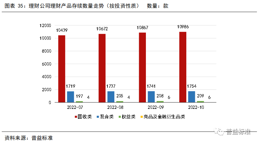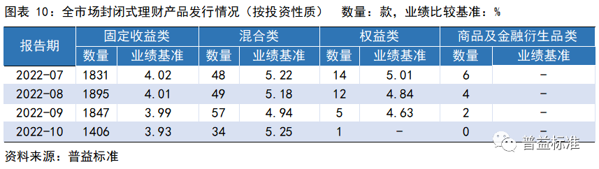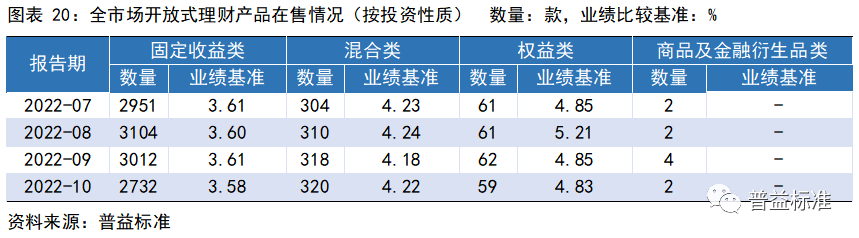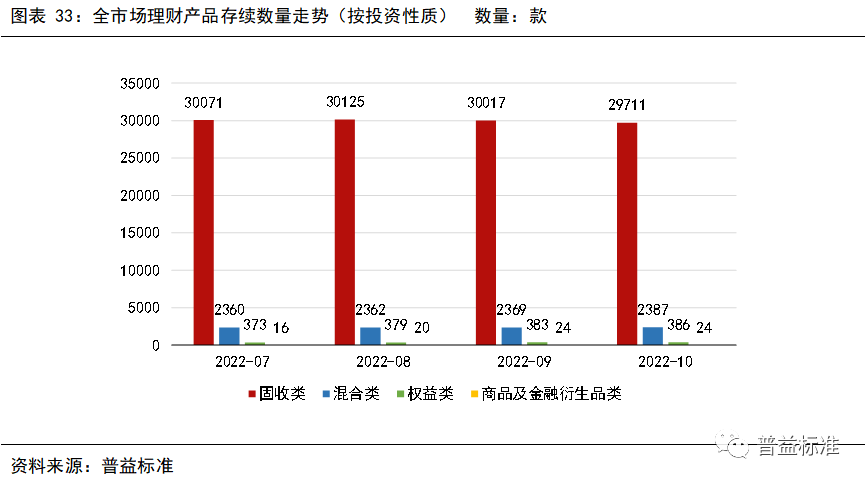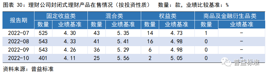 截至2022年10月末,全市场存续理财产品共33332款,环比减少285款,其中11827款为开放式产品,21505款为封闭式产品。从投资性质来看,固收类产品最多,共有29711款,环比减少306款。
