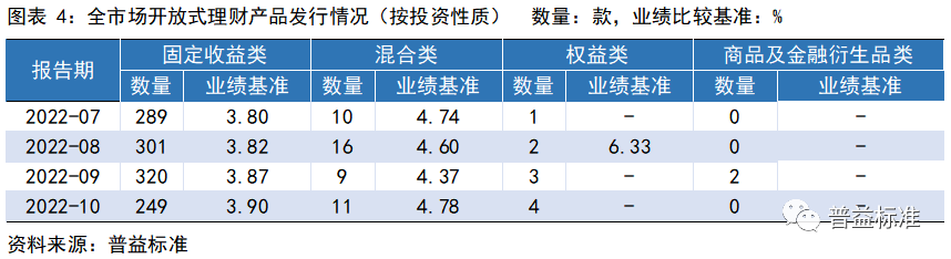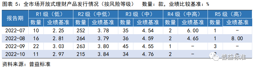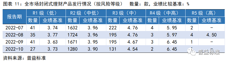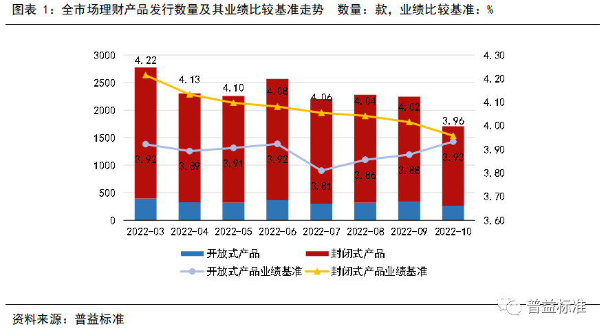 普益标准监测数据显示,2022年10月全市场共新发了1705款理财产品,环比减少540款,其中264款为开放式产品,其平均业绩比较基准为3.93%,环比上涨0.06个百分点;1441款为封闭式产品,其平均业绩比较基准为3.96%,环比下跌0.06个百分点。