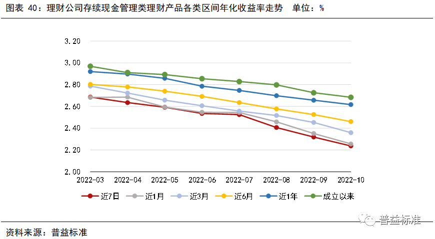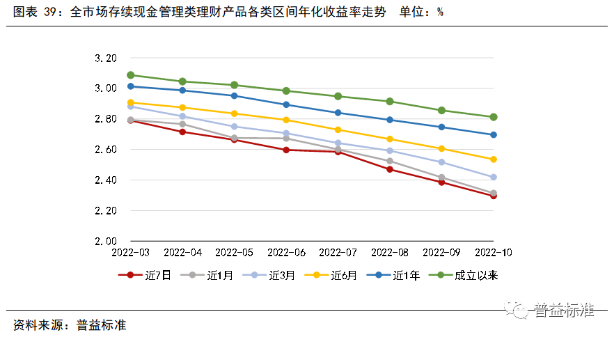 截至2022年10月末,理财公司存续现金管理类理财产品的近7日年化收益率的平均水平为2.24%,环比下跌0.08个百分点;近1个月年化收益率的平均水平为2.26%,环比下跌0.10个百分点;近3个月年化收益率的平均水平为2.36%,环比下跌0.09个百分点;近6个月年化收益率的平均水平为2.46%,环比下跌0.06个百分点;近1年收益率的平均水平为2.62%,环比下跌0.04个百分点;成立以来年化收益率的平均水平为2.68%,环比下跌0.04个百分点。