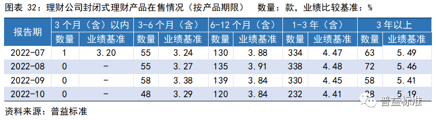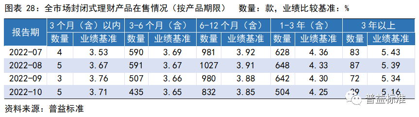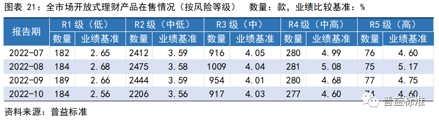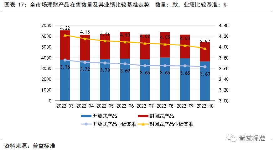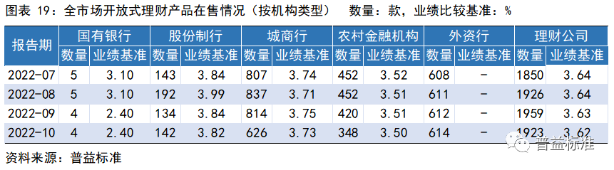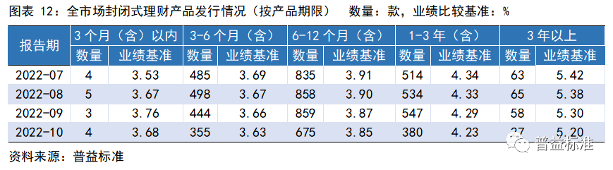 普益标准监测数据显示,2022年10月全市场共有5472款理财产品在售,环比减少675款,其中3657款为开放式产品,其平均业绩比较基准为3.63%,环比下跌0.02个百分点;1815款为封闭式产品,其平均业绩比较基准为3.97%,环比下跌0.06个百分点。