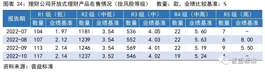 从风险等级来看,R2级产品最多,共有1280款,环比减少391款;R3级产品次之,共有131款,环比减少64款;R1级、R4级、R5级产品相对较少,合计仅有30款。业绩比较基准方面,R4级产品的平均业绩比较基准较高,达6.45%,环比持平;R1级产品的平均业绩比较基准较低,为3.73%,环比上涨0.10个百分点。