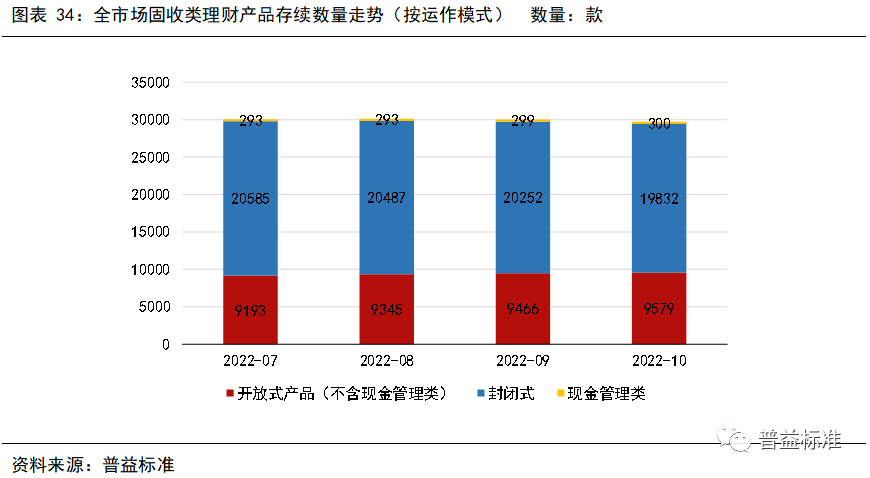上述29711款存续的固定收益类产品中,现金管理类产品有300款,环比增加1款;开放式产品(不含现金管理类)有9579款,环比增加113款;封闭式产品有19832款,环比减少420款。
