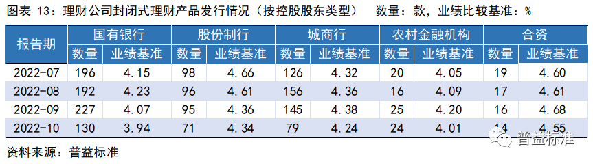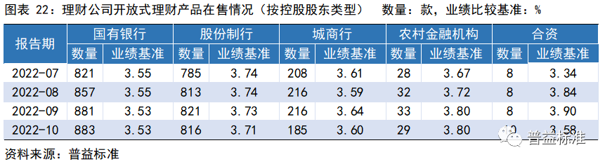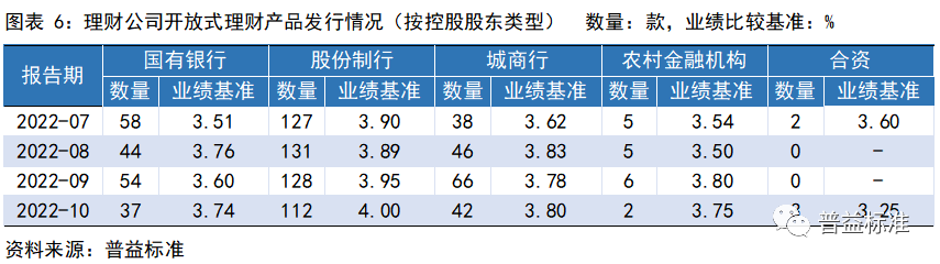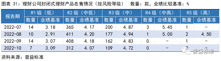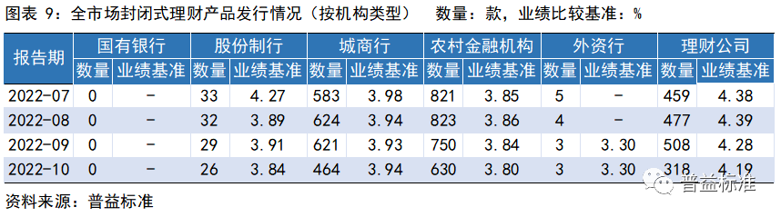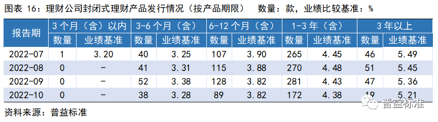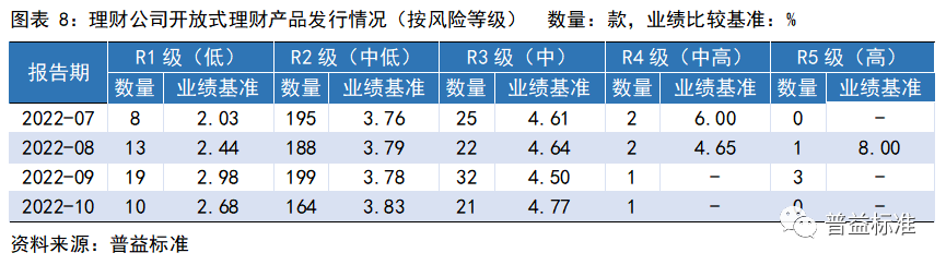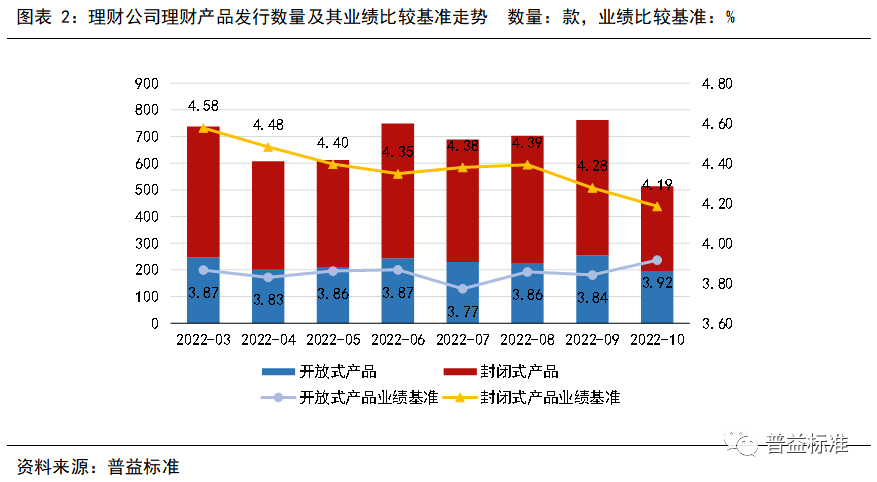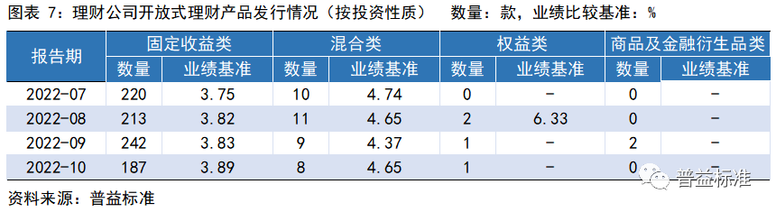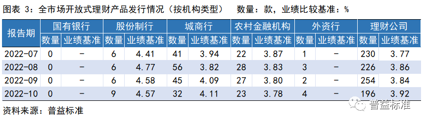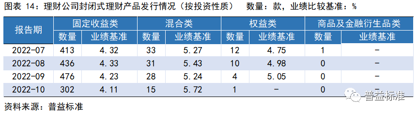 2022年10月理财公司新发514款理财产品,环比减少248款,占全市场理财产品发行量的30.15%,其中196款为开放式产品,其平均业绩比较基准为3.92%,环比上涨0.07个百分点;318款为封闭式产品,其平均业绩比较基准为4.19%,环比下跌0.09个百分点。