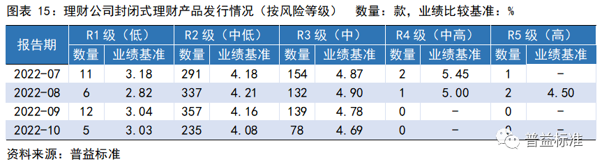 从风险等级来看,R2级产品最多,共有312款,环比减少96款;R3级产品次之,共有109款,环比减少53款;R1级、R4级、R5级产品相对较少,合计仅有7款。业绩比较基准方面,R3级产品的平均业绩比较基准较高,达4.72%,环比下跌0.11个百分点;R1级产品的平均业绩比较基准较低,为3.09%,环比上涨0.02个百分点。