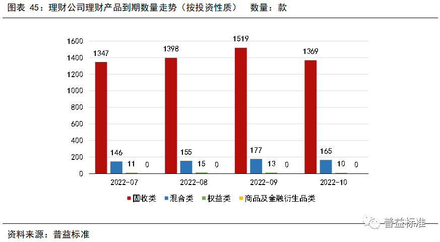 从投资性质来看,固收类产品最多,共有29711款,环比减少306款;混合类产品次之,共有2387款,环比增加18款;权益类、商品及金融衍生品类产品相对较少,合计仅有410款。
