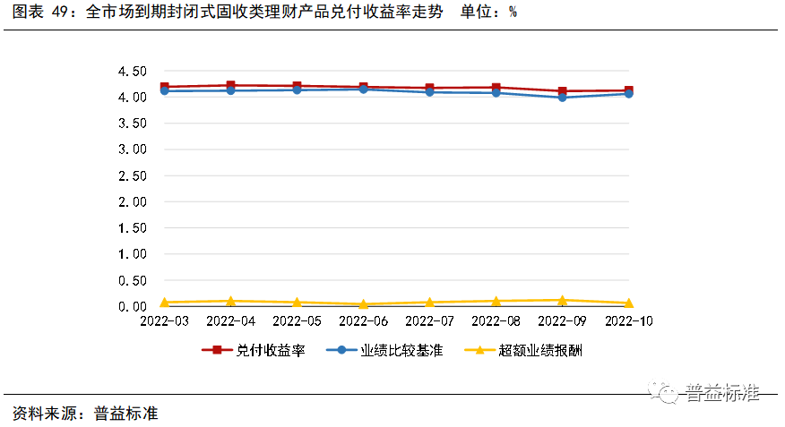 2022年10月全市场到期封闭式固收类理财产品的平均兑付收益率(年化)为4.12%,环比上涨0.01个百分点,超过其平均业绩比较基准0.07个百分点。