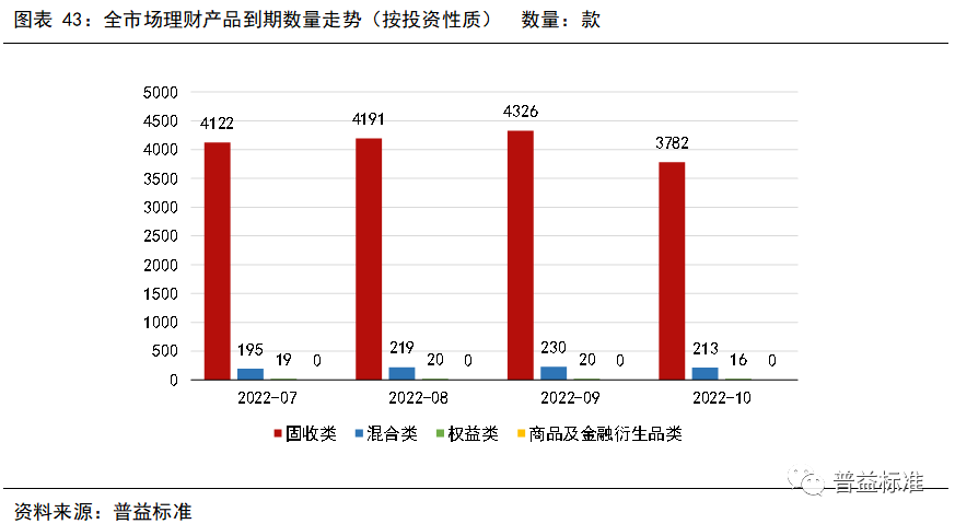 2022年10月全市场共有4012款理财产品到期,环比减少569款,其中2220款为开放式产品,1792款为封闭式产品。从投资性质来看,固收类产品最多,共有3782款,环比减少544款。