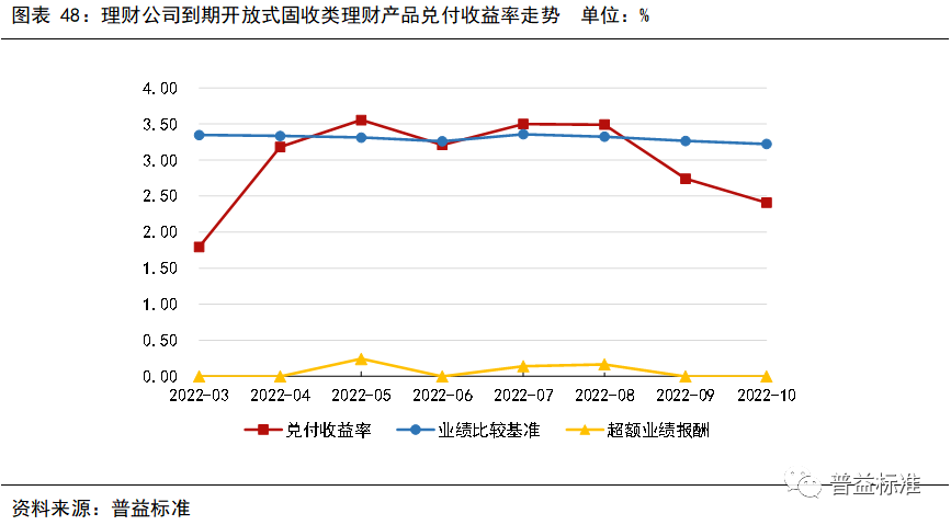 2022年10月理财公司到期开放式固收类理财产品的平均兑付收益率(年化)为2.41%,环比下跌0.33个百分点,落后其平均业绩比较基准0.81个百分点。