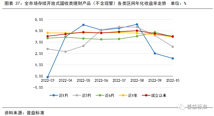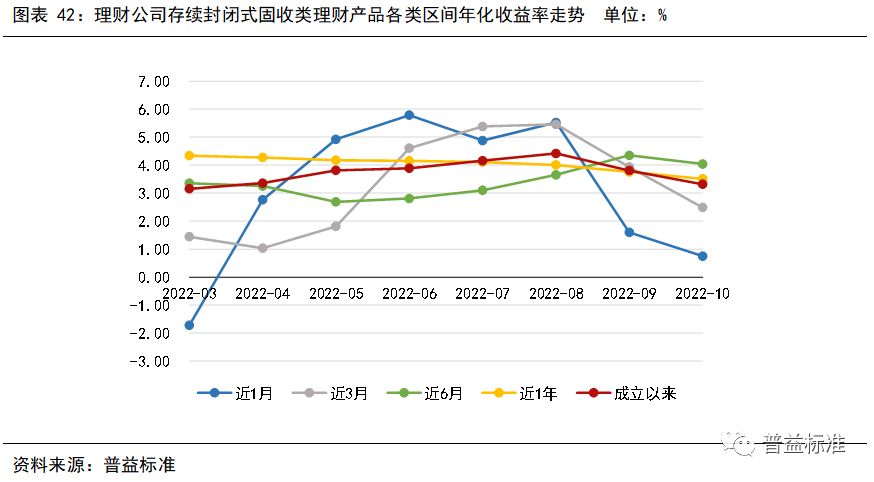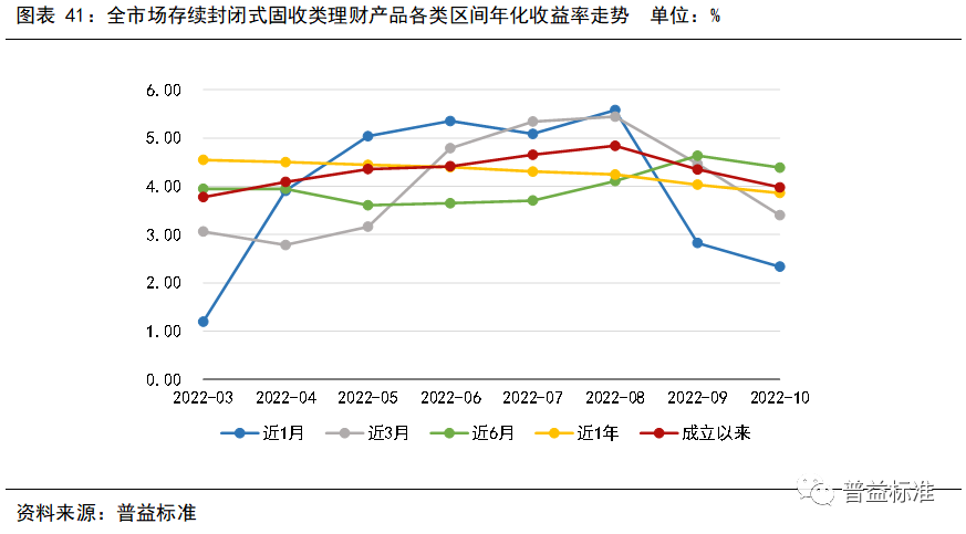 截至2022年10月末,理财公司存续封闭式固收类理财产品的近1个月年化收益率的平均水平为0.75%,环比下跌0.85个百分点;近3个月年化收益率的平均水平为2.49%,环比下跌1.44个百分点;近6个月年化收益率的平均水平为4.04%,环比下跌0.31个百分点;近1年收益率的平均水平为3.51%,环比下跌0.25个百分点;成立以来年化收益率的平均水平为3.32%,环比下跌0.49个百分点。