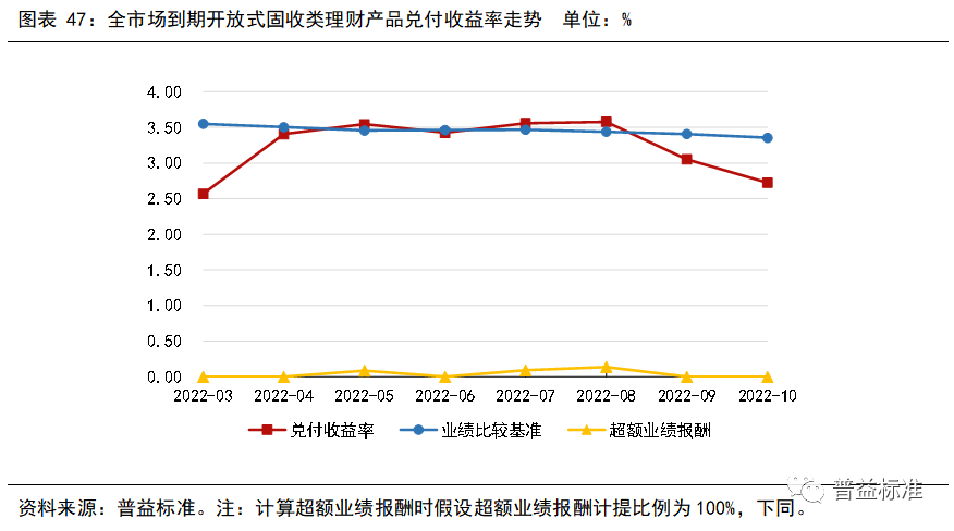 2022年10月全市场到期开放式固收类理财产品的平均兑付收益率(年化)为2.73%,环比下跌0.33个百分点,落后其平均业绩比较基准0.63个百分点。