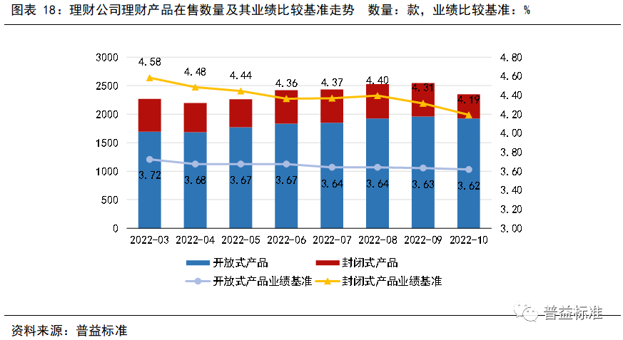 2022年10月理财公司有2351款理财产品在售,环比减少193款,占全市场理财产品在售量的42.96%,其中1923款为开放式产品,其平均业绩比较基准为3.62%,环比下跌0.01个百分点;428款为封闭式产品,其平均业绩比较基准为4.19%,环比下跌0.12个百分点。