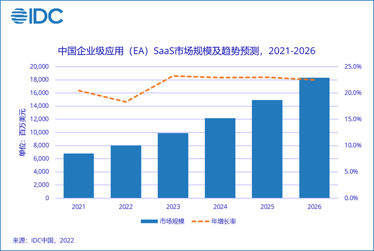 IDC(国际数据公司)最新发布的《IDC中国企业级应用管理(Enterprise Application, 以下简称为EA)SaaS市场2021年下半年跟踪报告》中显示,2021年中国EA SaaS市场规模达67.8亿美金,同比增长20.5%。 IDC预计,到2026年,中国EA SaaS市场规模将达到183.1亿美金,以22%的CAGR快速增长,引领整个SaaS市场持续稳定发展。考虑到疫情对于中国经济的反复影响,对比上一轮预测,IDC降低了EA SaaS市场的未来增速。但,随着企业数字化转型的不断深化,企业需要用数字化的手段、标准化流程来提高效率和节约成本。到2023年,中国EA SaaS市场基本回温,重新恢复稳定快速增长。