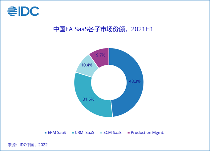 根据IDC定义,中国企业级应用软件(Enterprise Application,以下简称为EA)市场包括以下四个二级市场,分别是中国客户关系管理(以下简称为CRM)SaaS市场、中国企业资源管理(以下简称为ERM)SaaS市场、中国供应链管理(以下简称为SCM)SaaS市场以及中国制造生产类相关应用SaaS市场;其中,中国CRM SaaS市场市场份额占比最高,引领中国整个企业级应用软件SaaS市场发展。其中CRM市场是目前整个EA市场中SaaS渗透率最高的市场,其市场份额占到整体EA SaaS市场的32%,未来五年会以23.1%的CAGR增长。在ERM市场中,HCM和财务市场中的差旅与费控(T&E)两块市场SaaS相对比较成熟,企业对其接受程度也较高,其他模块,例如:资产管理、企业绩效管理等依旧以传统OP部署模式为主。