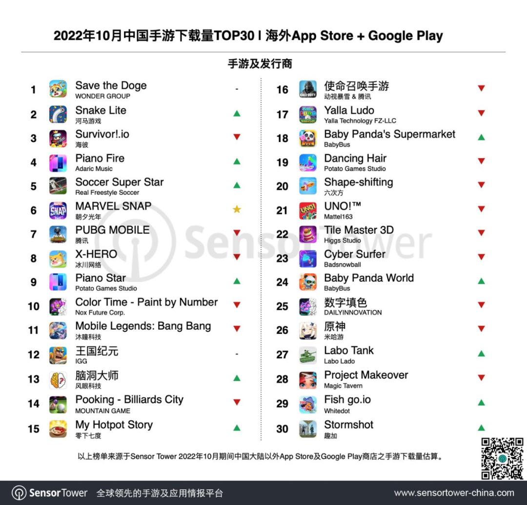 朝夕光年旗下IP改编新游《MARVEL SNAP》登陆海外市场以来下载量迅速攀升,上线不到2周下载量已突破670万次,位居本月下载榜第6名。