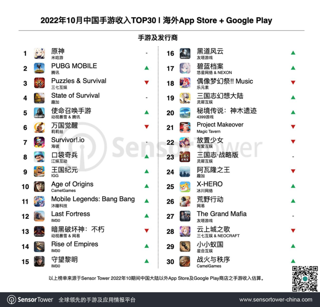Sensor Tower商店情报平台最新数据显示,2022年10月中国手游产品在海外市场收入及下载量排行榜,详细榜单变化如下。