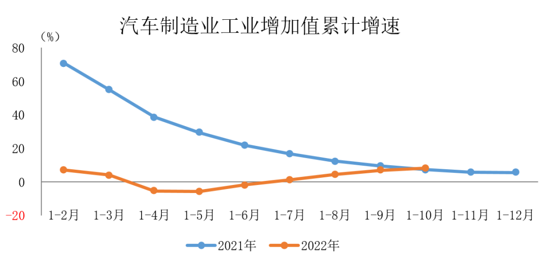 中国汽车工业协会:2022年1-10月汽车制造业工业增加值较快增长 10月份国民经济经受住了国内外多重超预期因素的冲击,持续保持恢复态势。但国际环境更趋复杂严峻,国内经济恢复基础尚不牢固。 据中国汽车工业协会整理的国家统计局数据显示,2022年10月,汽车制造业工业增加值同比增长18.7%,高于同期全国规模以上工业增加值13.7个百分点。 1-10月,汽车制造业工业增加值同比增长8.1%,比1-9月提升1.2个百分点,高于同期制造业4.7个百分点。 更多阅读:中国汽车工业协会:2021年1-10月汽车制造业工业增加值同比呈小幅增长中国汽车工业协会:2023年一季度汽车制造业工业增加值同比增长中国汽车工业协会:2021年1-2月汽车制造业工业增加值同比大幅增长中国汽车工业协会:2022年汽车制造业工业增加值同比小幅增长中国汽车工业协会:2023年1-5月汽车制造业工业增加值继续保持两位数增长中国汽车工业协会:2023年1-2月汽车制造业工业增加值同比微降中国汽车工业协会:2022年1-7月汽车制造业工业增加值同比由负转正中国汽车工业协会:2022年1-11月汽车制造业工业增加值增速有所回落中国汽车工业协会:2022年8月汽车制造业工业增加值同比增长30.5%中国汽车工业协会:2023年1-8月汽车制造业工业增加值保持较快增长中国汽车工业协会:2022年1-9月汽车制造业工业增加值较快增长中国汽车工业协会:2022年5月汽车制造业工业增加值同比降幅明显收窄中国汽车工业协会:2023 年 1-4 月汽车制造业工业增加值同比保持增长中国汽车工业协会:2022年3月前十位轿车品牌销量排名中国汽车工业协会:2021年5月汽车工业运行情况简述