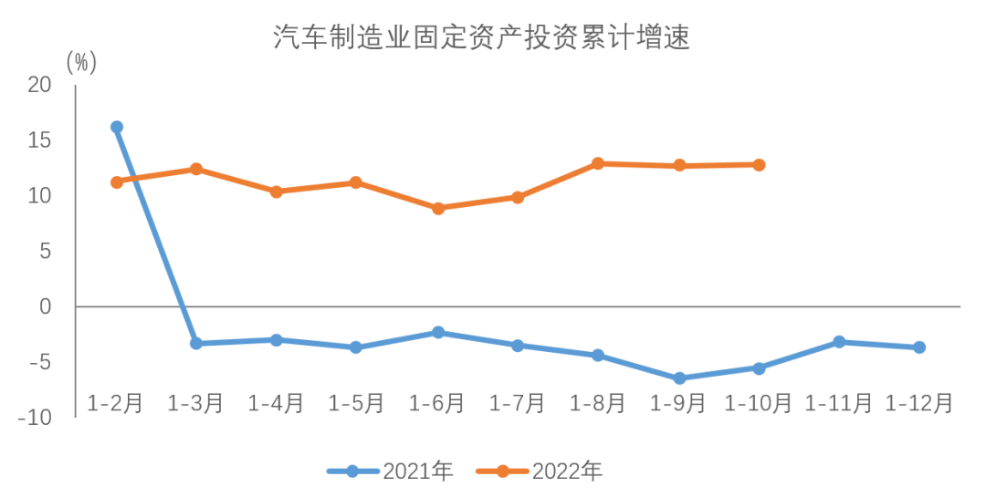 中国汽车工业协会:2022年1-10月汽车制造业固定资产投资快速增长 10月份,国民经济延续恢复态势,工业投资稳定增长,就业物价总体平稳,新动能积蓄增强,民生保障有力有效,经济社会大局稳定。 据中国汽车工业协会整理的国家统计局数据显示,2022年1-10月,汽车制造业固定资产投资快速增长。 1-10月,汽车制造业固定资产投资同比增长12.8%,高于制造业固定资产投资3.1个百分点,高于全国固定资产投资7.0个百分点。 更多阅读:中国汽车工业协会:2022年1-7月汽车制造业固定资产投资平稳增长中国汽车工业协会:2023年1-7月汽车制造业固定资产投资保持较快增长中国汽车工业协会:2023年1-2月汽车制造业固定资产投资同比增长23.8%中汽协会:2022年1-2月汽车制造业固定资产投资同比呈较快增长中国汽车工业协会:2022年1-9月汽车制造业固定资产投资快速增长中国汽车工业协会:2023年1-4月汽车制造业固定资产投资中国汽车工业协会:2023年1-8月汽车制造业固定资产投资保持较快增长中国汽车工业协会:2022年3月前十位轿车品牌销量排名中国汽车工业协会:2021年5月汽车工业运行情况简述中国汽车流通协会:2020年4月中国进口汽车市场月报2020年1月份京城汽车市场分析中国汽车工业协会:2023年1-2月我国汽车商品出口金额前十国情况简析中国汽车流通协会:2020年3月份国内狭义乘用车市场销量达104.5万辆 同比下降40.4%中国汽车流通协会:2020年第一季度豪华品牌新增授权4s店57家 退网4s店41家中国汽车流通协会:2022年4月中国汽车保值率报告