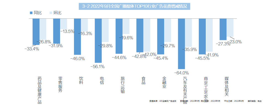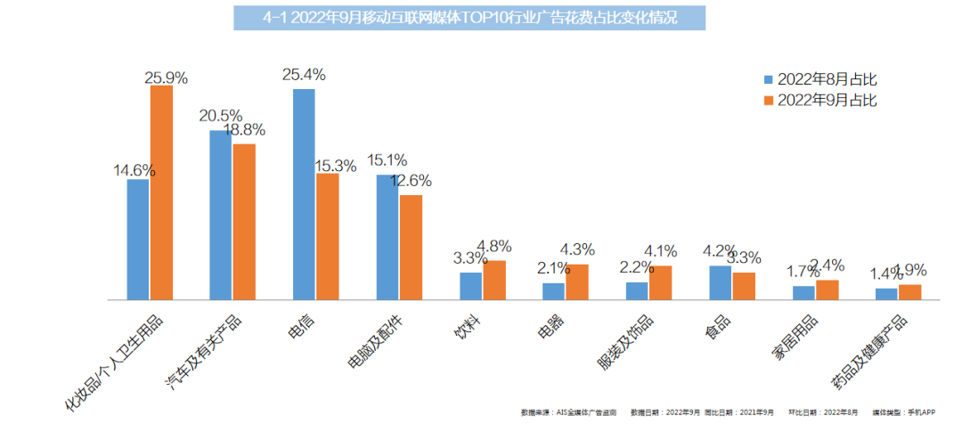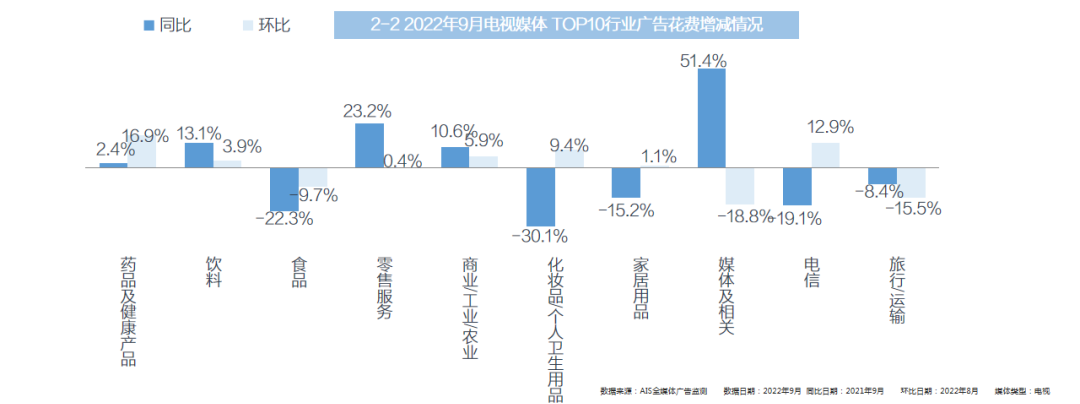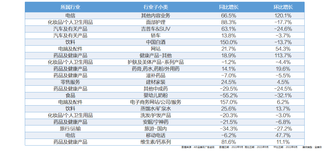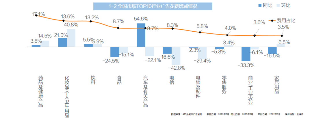 全媒体·TOP10行业:药品及健康产品、化妆品/个人卫生用品、饮料行业均呈现同比、环比双上涨态势。