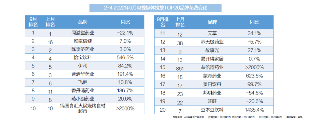 电视·TOP20行业子小类:药品及健康产品行业的子小类占9个。