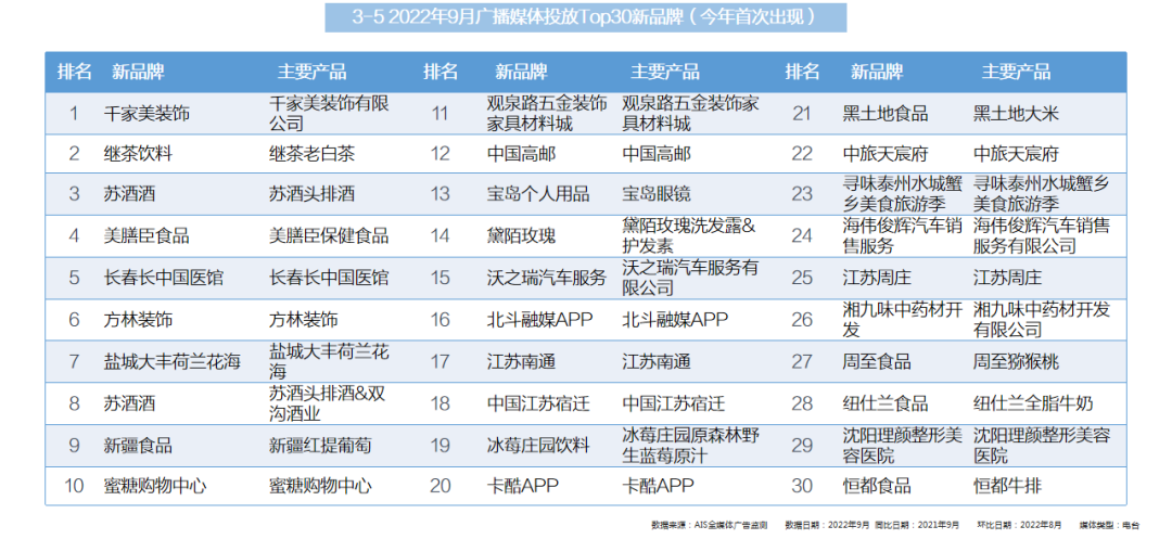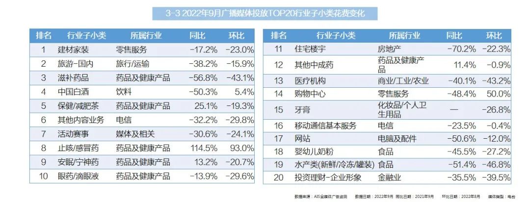 - TOP20子小类中,药品及健康产品行业有9个子小类上榜,其中投放刊例花费最多的是健康产品-其他小类,环比增长最大的是止咳/感冒药小类;其次饮料行业有4个小类上榜,投放刊例花费最多的是中国白酒小类,该品类同时也是9月在电视媒体中投放刊例花费最多的行业子小类;