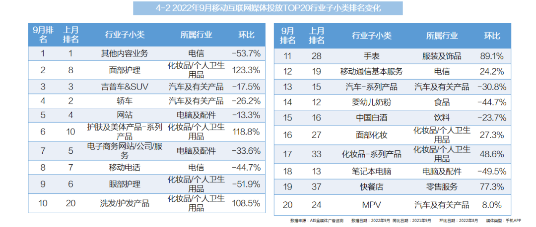 - 投放花费TOP10行业中,前三个行业出现同比、环比双上升的良好态势;同比上升幅度最大的是汽车及有关产品行业、环比升幅最大的则是化妆品/个人卫生用品行业;
