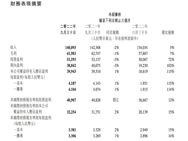 近日消息,腾讯控股发布2022年第三季度财报,财报显示,腾讯控股第三季度营收1400.93亿元,同比下滑2%;公司权益持有人应占盈利399.43亿元,同比增长1%;非国际财务报告准则下净利润为322.54亿元,同比增长2%。