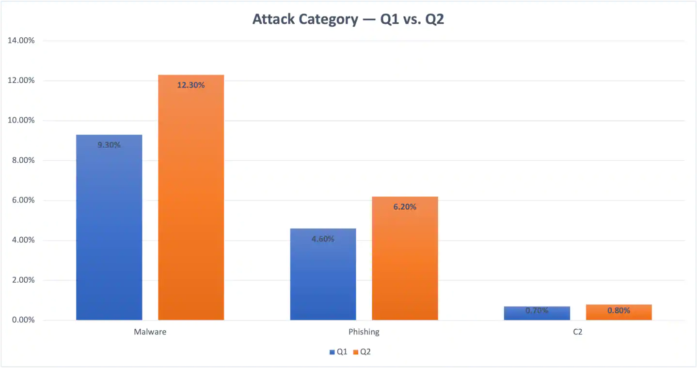 前言“有问题?找 DNS。” 虽然在我们的行业中,这种说法有点调侃的意味,但 DNS 确实可以为我们提供大量有关现存威胁态势的信息。通过分析来自 Akamai 庞大基础架构的信息,我们能够获得有关互联网行为方式的一些重要见解。在本博客文章中,我们将探讨这些针对流量模式的见解,及其如何影响互联网连接另一端的人们。Akamai 流量见解按类别划分的攻击凭借 Akamai 统揽不同行业、各个地理位置的视野,我们观察到,在 2022 年第二季度,我们所监测的设备中有 12.3% 至少曾有一次尝试访问恶意软件相关域。这表明这些设备可能已被入侵。在网络钓鱼和 C2 方面,我们可以看到,6.2% 的设备访问过网络钓鱼相关域,0.8% 的设备访问过 C2 相关域。虽然这些数字乍看起来可能并不起眼,但要考虑到所涉及的规模是数百万台设备。考虑到这一点,再加上 C2 是最恶性的威胁,这样的数据非常可观,而且影响重大。将 2022 年第二季度的结果与 2022 年第一季度的结果(图 1)进行比较,我们可以发现,所有类别在第二季度都有小幅增长。我们将这些增长归因于季节性变化,与威胁态势重大变化无关。