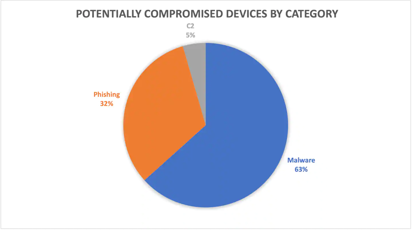 这些用户的设备中有 63% 曾与恶意软件或勒索软件域通信,32% 曾与网络钓鱼域通信,5% 曾与 C2 域通信。