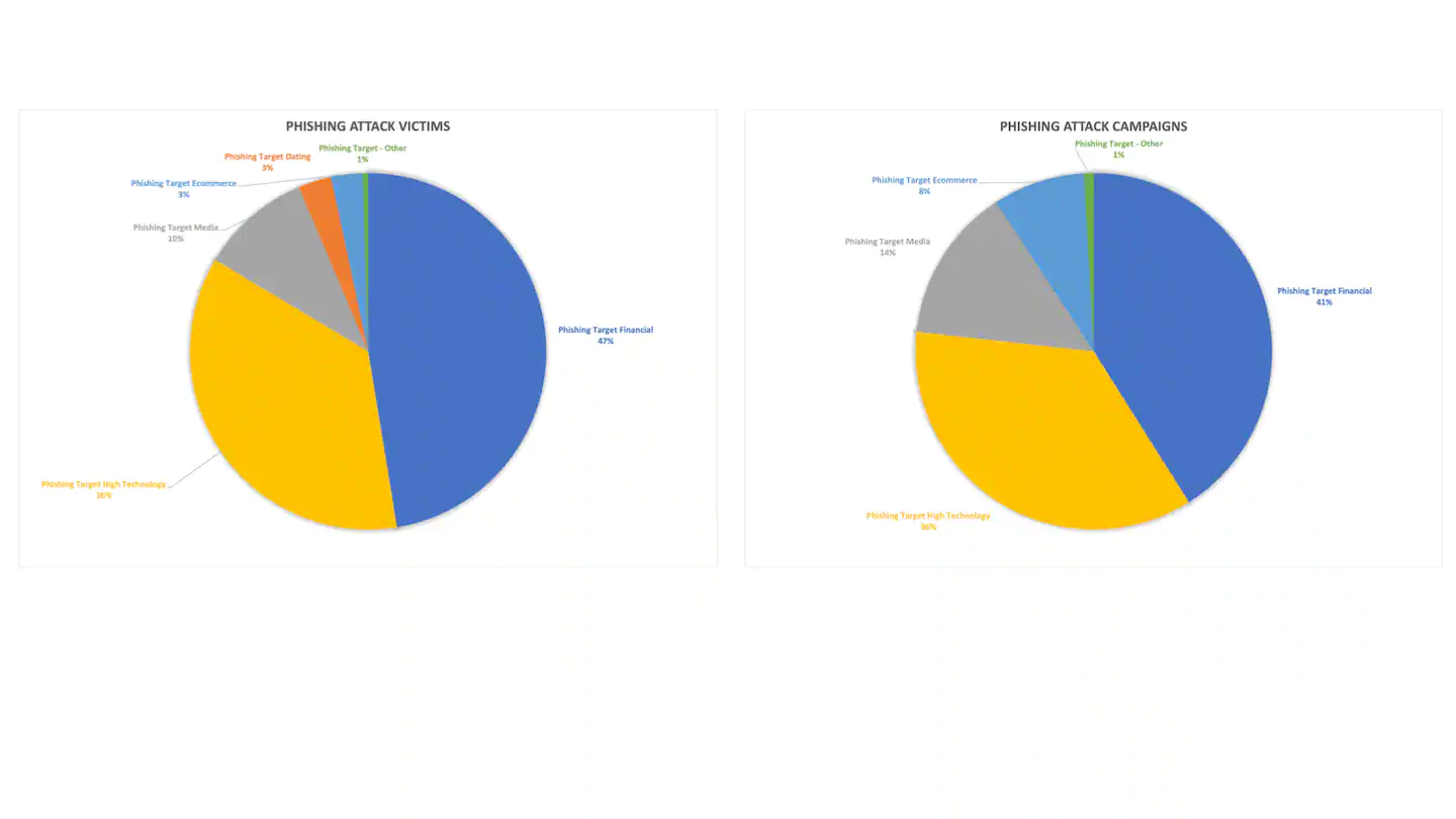 经过对网络钓鱼攻击的进一步研究,研究人员发现金融服务和高科技领域用户是网络钓鱼活动最常见的目标,分别有 47% 和 36% 的受害者。
