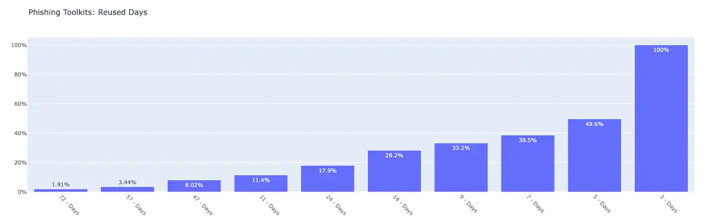 通过跟踪现实环境中被重复使用的 290 个不同的网络钓鱼工具包,并统计每个工具包在 2022 年第二季度重复使用的天数(同一天内多次使用时,仅按一天统计),结果表明,1.9% 的受跟踪工具包在至少 72 天后被重新激活。此外,49.6% 的工具包至少重复使用了 5 天,这表明有很多用户多次受到攻击。这揭示了这些工具包的伪装程度和危险性,即使精通相关技术的用户也是防不胜防。