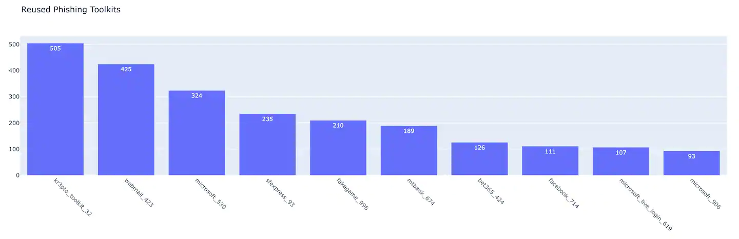 2022 年第二季度最常用的网络钓鱼工具包(Kr3pto,一种针对英国银行客户的网络钓鱼活动,规避了多重身份验证 [MFA])托管在 500 多个不同的域中。