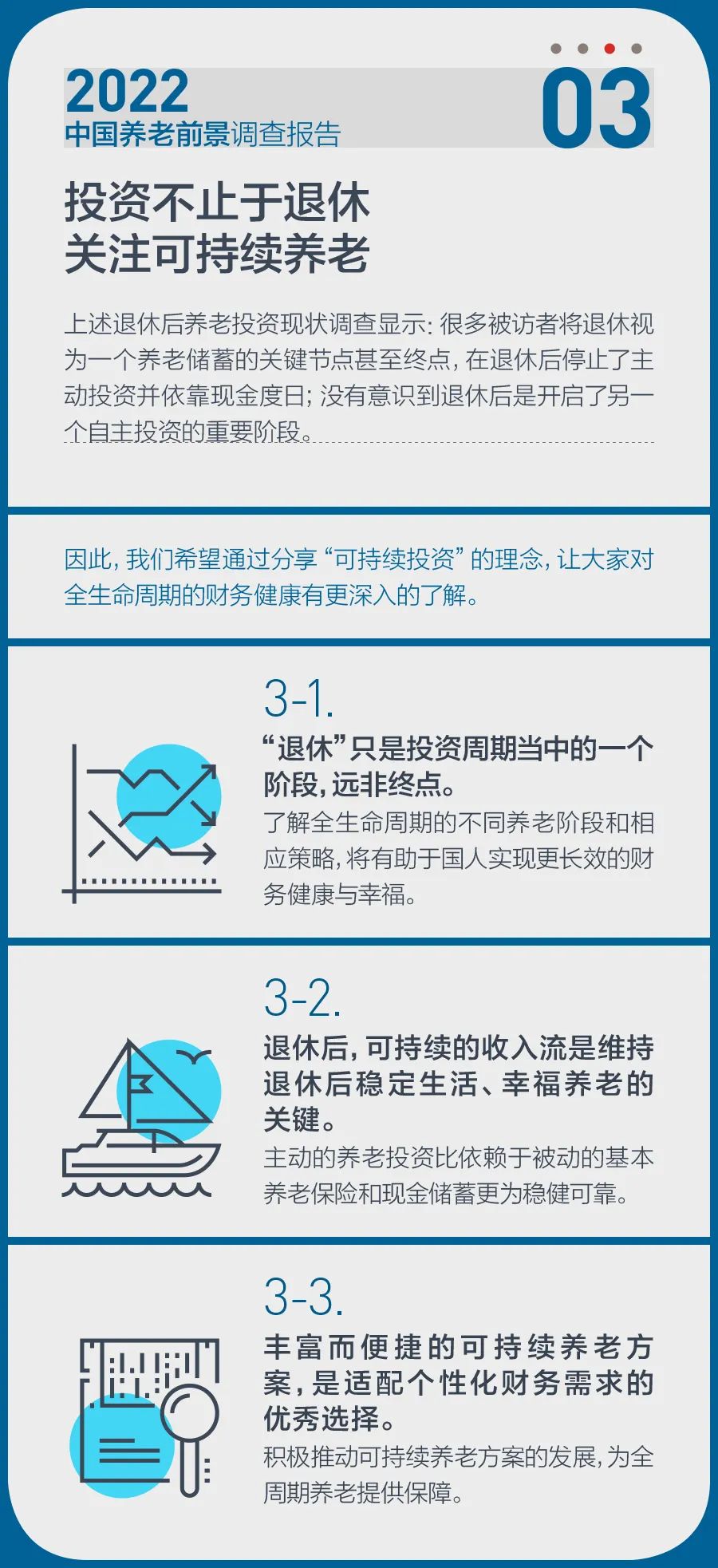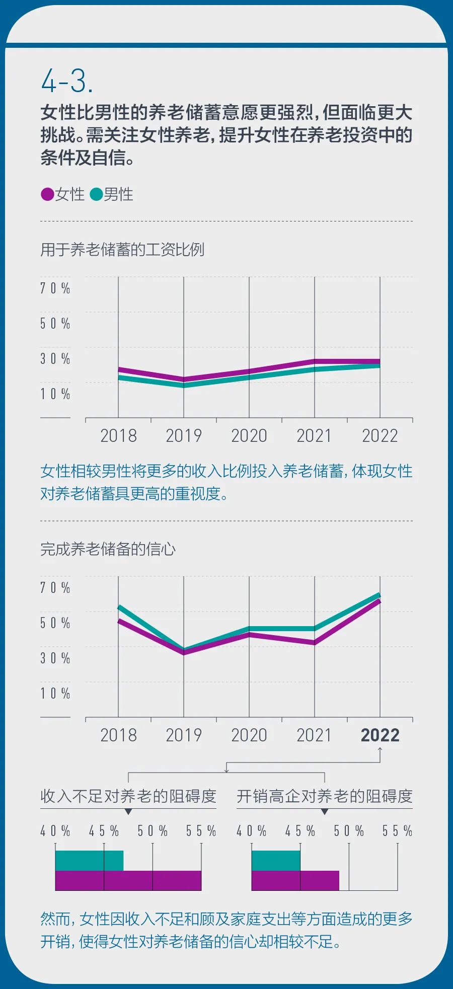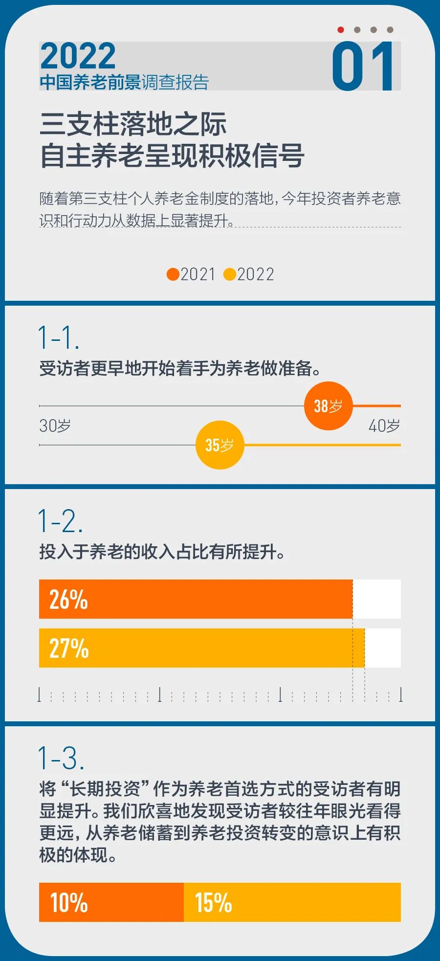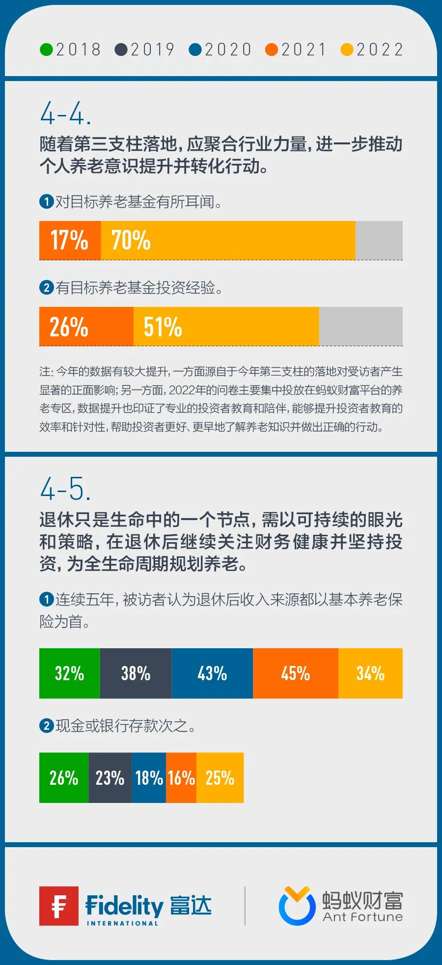 富达国际:2022年中国养老前景调查 随着中国人口老龄化问题加剧以及一支柱社保基金收支缺口扩大,引导个人提前规划和积累养老储备变得愈发重要。万众瞩目之下,第三支柱政策在今年四月正式落地,九月个人养老金的税收优惠政策也正式明确,再到11月4日《个人养老金实施办法》的颁布,多层次、多支柱的养老保险体系也进一步明晰了方向。在这个重要的时间点上,富达国际和蚂蚁财富平台联合发布《2022年中国养老前景调查报告》,围绕退休这个时间点,重点分享“可持续养老”的理念。无论是对于年轻一代,还是对于接近退休或已退休的人群来说,养老都是贯穿人生始终的议题。 富达与蚂蚁的合作已经走过了五个年头,累计收集了超过17万份问卷,见证中国年轻一代养老意识和行动力的提升;同时,我们对观察到的养老问题进行深入思考,希望借助富达的全球经验和专业养老知识,帮助投资者更高效地积累养老储备,引领行业关注中国养老行业的方方面面,协同推动行业进步。 更多阅读:富达国际:年轻人月均储蓄1624元 储蓄率创三年来新高世界各城市60平米房屋成本途虎养车:2018中国汽车用户线上养护行为报告Nature:携带相同基因组的癌细胞或许会表现出不同的行为!自如研究院:2021年10城毕业生租房报告国际顶刊《PNAS》:爱发朋友圈的人,更容易长寿在中国,只抓一个权健是不够的58同城&安居客:2023年8月国民安居指数报告58安居客研究院:2023年8月部分城市各区域二手房挂牌价格环比均上浮抑郁会“传递”?联合国粮农组织食品价格指数2025年4月上行正所谓「饱暖思淫欲」,这种蛋白质竟是“催情药”!Nature揭秘从面包到爱情的科学机制气候和自然的多重危机下,中国企业如何打造“第二增长曲线”?越吃越开心!分析万人7年健康数据发现:每天摄入30克坚果,可将抑郁风险降低17%!58安居客研究院:2023年6月全国二手房市场月报