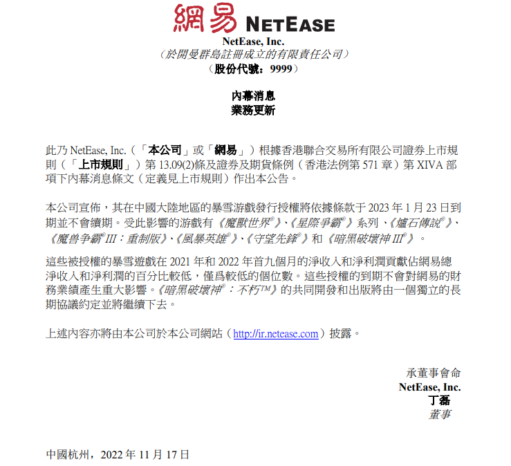 代理自暴雪的游戏,对网易2021年和2022年前九个月的净收入和净利润贡献百分比,均为较低的个位数。授权到期对网易的财务业绩将不会产生重大影响。《暗黑破坏神:不朽》的联合开发和发行由另一份长期协议所涵盖。