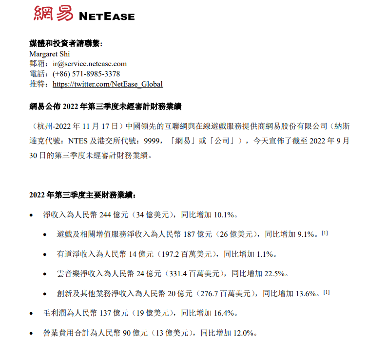 财报显示,网易第三季度毛利137亿元,预估133.2亿元;网易第三季度在线游戏服务净收入187亿元;第三季度网易有道净收入为14亿元,与2021年第三季度相比增长1.1%。第三季度云音乐净收入为24亿元,同比增长22.5%。