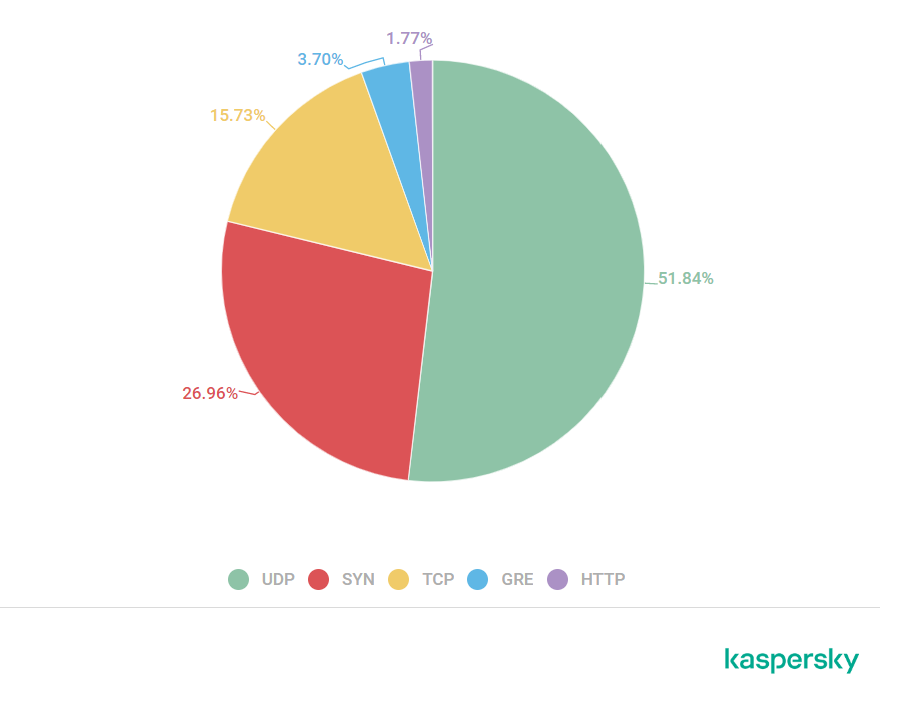 - UDP洪水占攻击总数的51.84%,SYN洪水占26.96%。