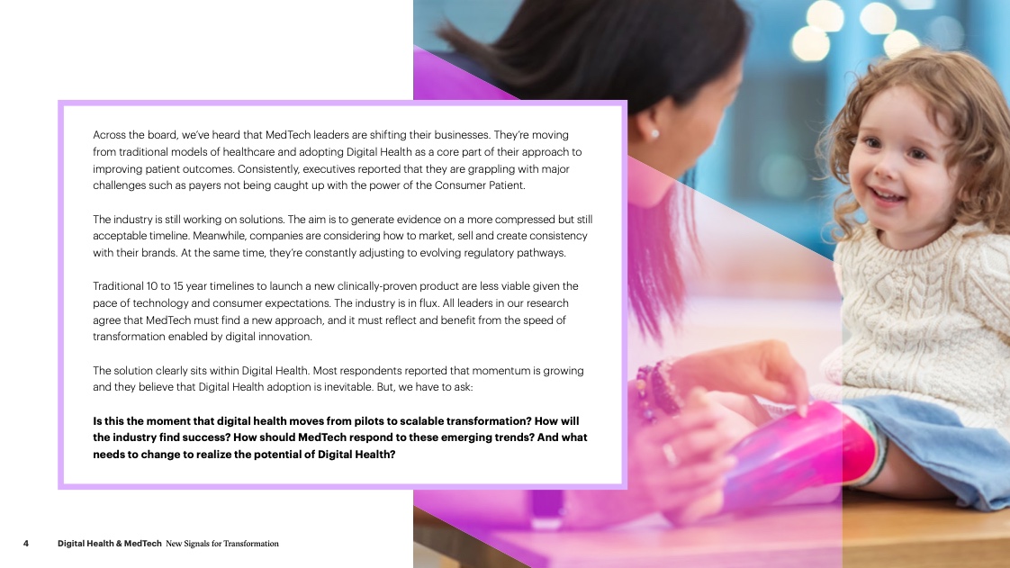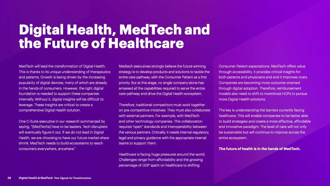这份名为“数字健康和医疗科技”的报告基于对全球150多名医疗科技高管的调查,揭示了一种从传统医疗模式的转变。领导者将数字健康作为其改善患者治疗结果的核心部分。超过3/4的高管(75%)表示,扩大护理环境将显著调整公司的长期战略并改变商业模式。