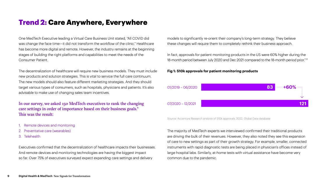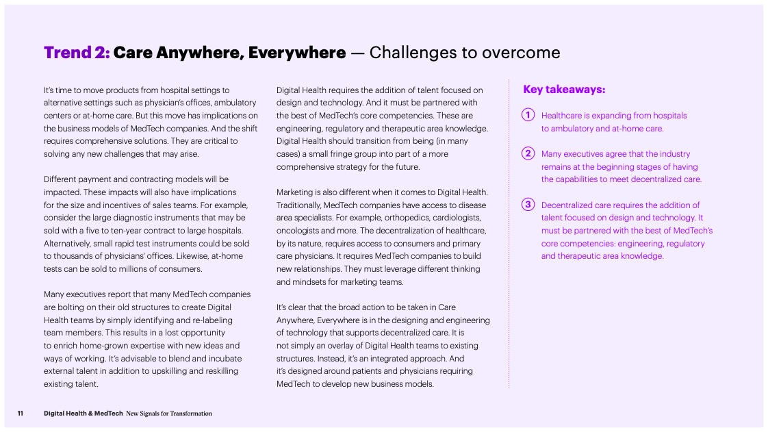 随时随地护理:随着消费者越来越多地期望以他们想要的方式、地点和时间获得护理,医疗保健正日益从医院扩展到门诊和家庭护理场所。受访的医疗科技高管表示,尽管传统产品继续推动收入增长,但将护理扩展到新环境是其增长战略的关键部分。